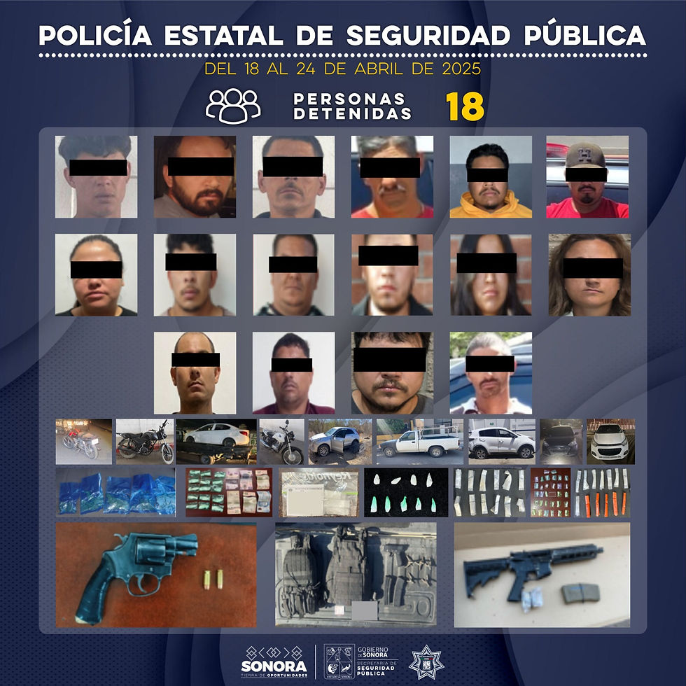 Durante la semana del 18 al 24 de abril, y en atención a reportes ciudadanos, así como en patrullajes de vigilancia en distintas colonias de Hermosillo y en el poblado Miguel Alemán, elementos de la Policía Estatal de Seguridad Pública (PESP) detuvieron a 18 personas y recuperaron cinco vehículos con reporte de robo.