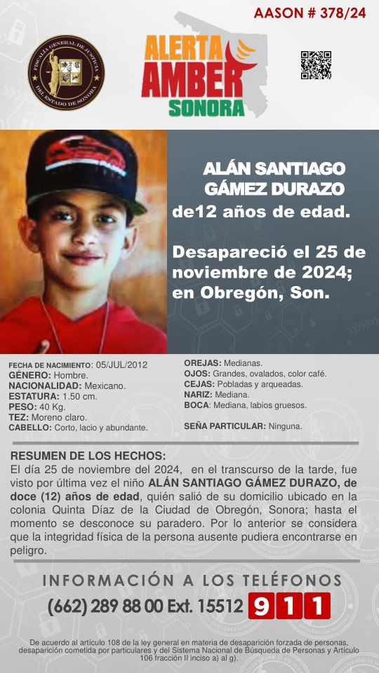 🚨 SE ACTIVA ALERTA AMBER SONORA PARA BÚSQUEDA y LOCALIZACIÓN DE ALÁN SANTIAGO GÁMEZ DURAZO, de 12 años de edad, * desapareció el 25 de noviembre de 2024 en Ciudad Obregón, Sonora.🚨
